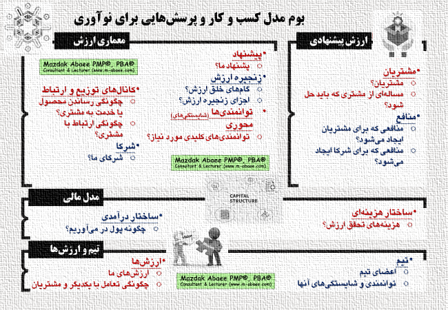 در نوشتههای قبلی نمونههایی از بومهایی که برای تعریف پروژه یا برنامهریزی رویدادها به کار گرفته میشوند، معرفی شدند. کاربرد بومها بسیار گستردهتر از موارد مورد اشاره است. یکی دیگر از کاربردهای بومها «تبیین مدل یا الگوی رفتاری کسب و کارها» است. اولین برخورد نگارنده با کاربرد بومها به صورت ساختار یافته از طریق همین […]